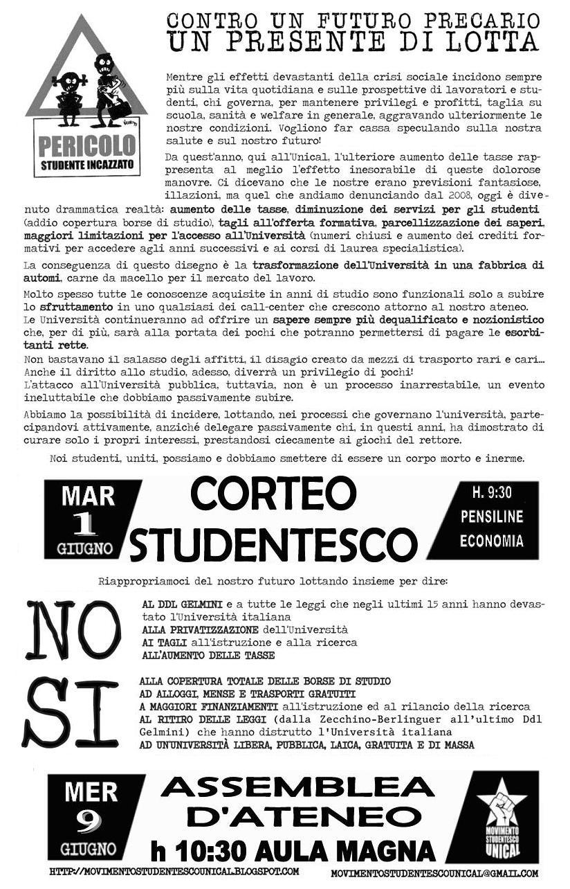 Oggi 24 maggio 2010, il Movimento Studentesco Unical, dopo un corteo rumoroso sul ponte Bucci si è ritrovato sotto il rettorato per protestare contro l'aumento delle tasse, frutto dei tagli della finanziaria del 2008 e della legge Gelmini. Ricostruendo le varie tappe del processo di (d)istruzione dell'università pubblica si può intravedere il complesso intreccio di trame, appetiti e interessi che si stanno addensando così insistentemente attorno al mondo universitario e che rispondono alle stesse logiche che stanno dietro al tentativo di privatizzazione di altri beni pubblici fondamentali rispetto ai quali il ddl Gelmini sembra infliggere l'ultimo colpo di grazia.